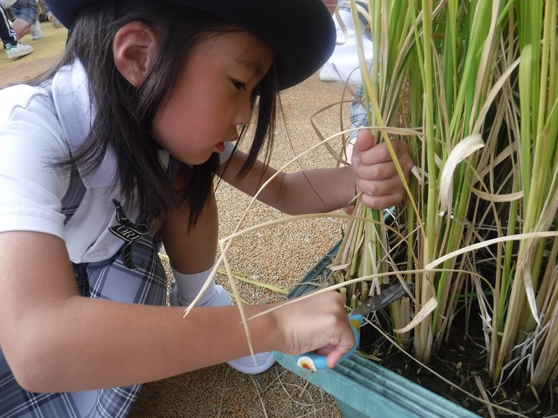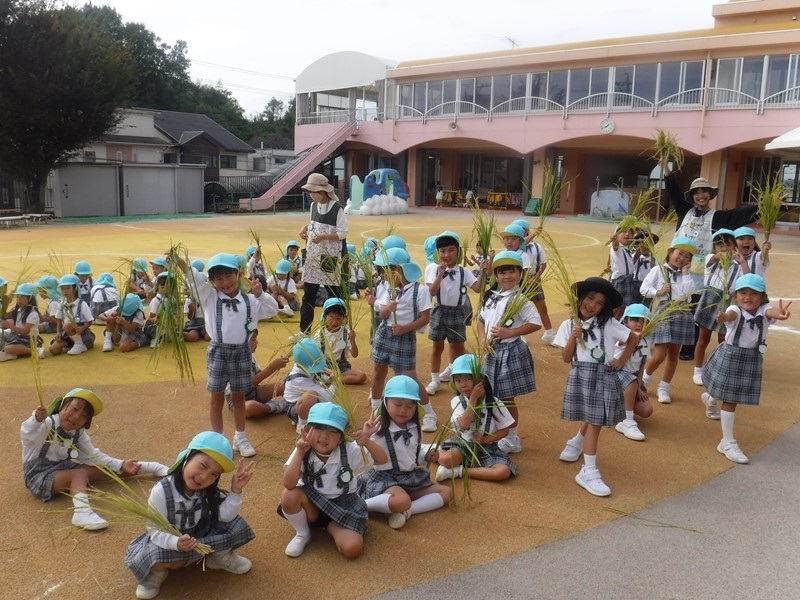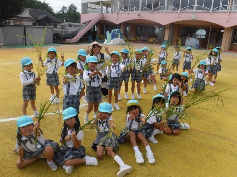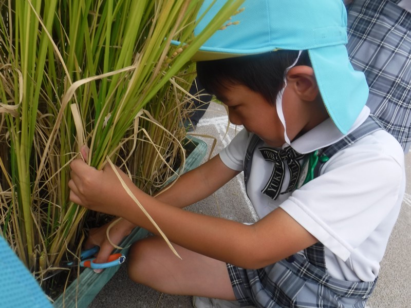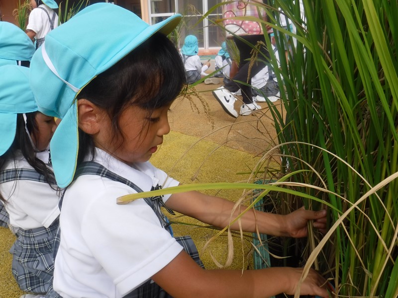 5月30日に一人3~4本ずつ植えたお米の苗が稲穂となり、収穫の時を迎えました。夏の暑い日に土が乾くことのないようたっぷり水を補充したり、鳥に食べられないよう網で守ったりしながら育てた大切な稲。成長を見守ってきた年長さんは、稲刈りをとても楽しみにしていました。