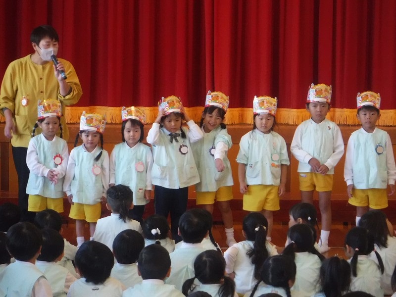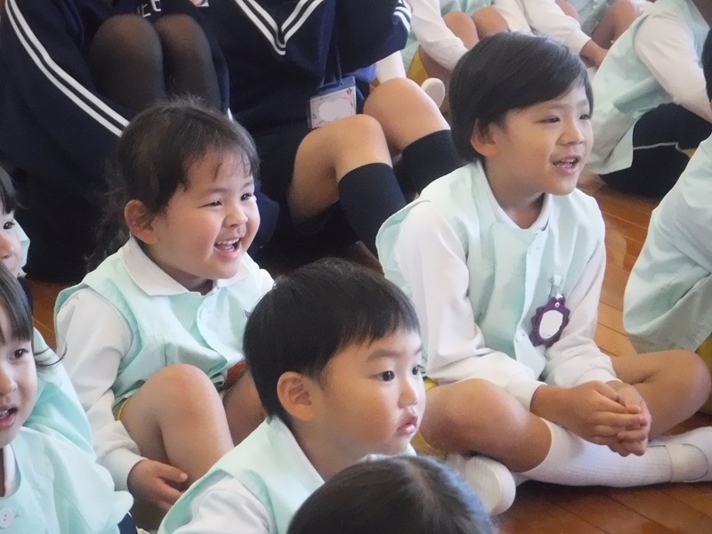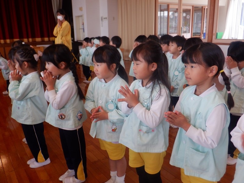 七五三とは、子どもが無事に成長したことへの感謝と、これからの健康を祈るお祝いの行事です。子ども達には「事故にあったり大きな病気になることもなく、ここまで大きく育つことができました。ありがとうございます。これからも見守っていて下さい。と神様にお礼とお願いをしようね。」と伝えていきました。そして「千歳飴の『ちとせ』は『1000歳』のことで、1000歳まで元気に長生きできますように・・・という願いを込めて食べるものだから、長い長い飴なんだよ。」と伝えていきました。満三歳児・年少児には少し難しかったようですが、年中児、年長児は真剣に聞く姿がありました。