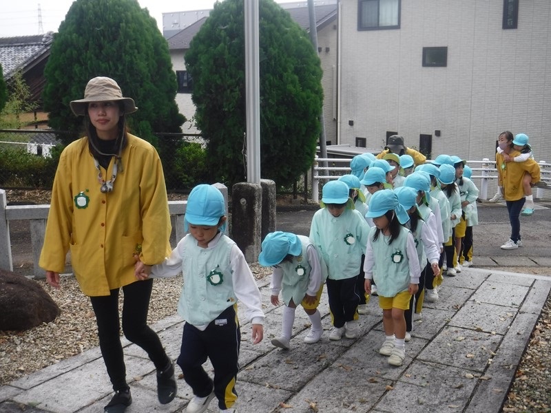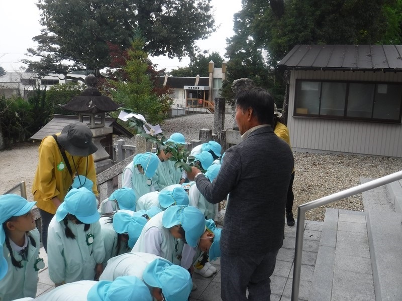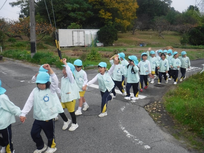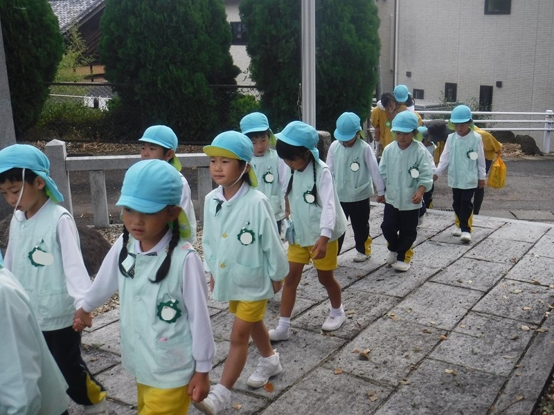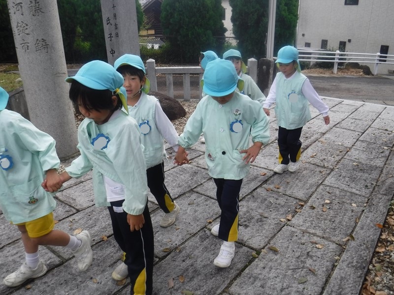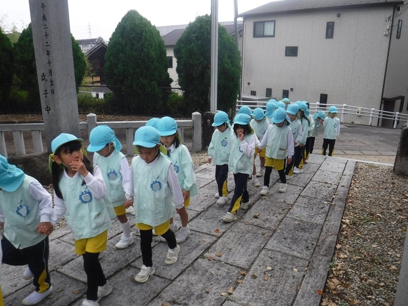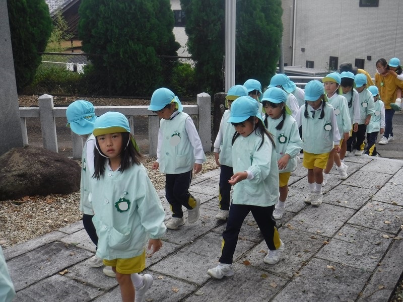 小学校での通学も意識することができるよう声を掛けながら道路を歩いていきました。押しボタン式の横断歩道の渡り方も知ることができました。莇生神社までは子どもの足で15分弱、景色を観て秋を感じながら元気に歩いていきました。