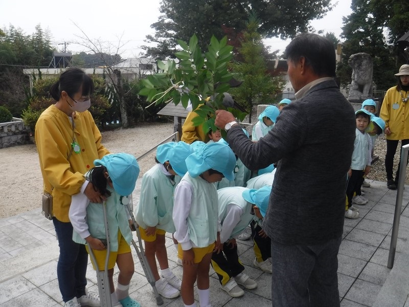 今日のご祈祷では普段とは違う遊戯室の厳粛な雰囲気の中、しっかりと御祈祷を受けていくことができました。二礼、二拍手、一礼の後、「祓いたまえ、清めたまえ・・・」と榊でお祓いしていきました。神様からもらったみかんはとてもおいしかったね。