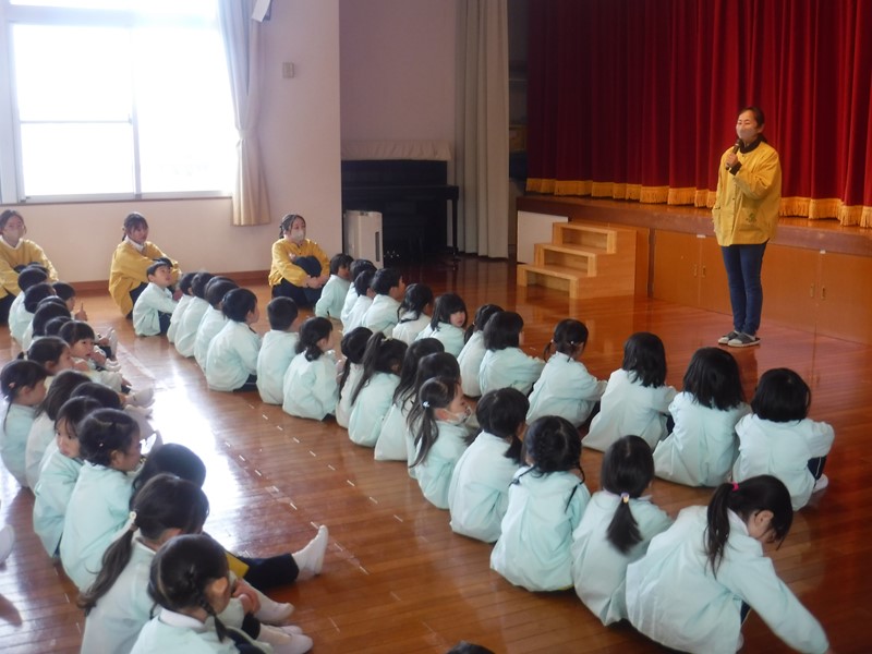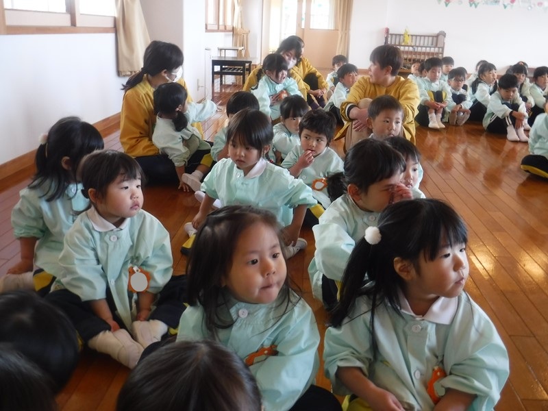始業式では、どの子も気を引き締めて入室し、式に参加する様子がありました。先生の話も正しい姿勢で聞いていましたよ。「冬休みの約束をきちんと守れたましたか?」と聞いていくとたくさんの子が「ハイ!ハイ!」と手を挙げてくれました(●^▽^●) 中には「朝早く起きれない日もありました。」と 正直に話してくれるお友だちもいましたね。先生たちもお寝坊しちゃった日もありましたよ。そして、年長さんがみんなの前で冬休みの思い出を発表してくれました。「おじいちゃん、おばあちゃんのうちに行きました。楽しかったです。」「お年玉をいっぱいもらって嬉しかったです。」しっかり言えてかっこよかったね。さすが年長さん‼