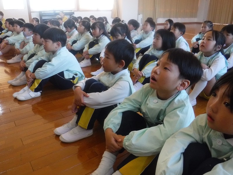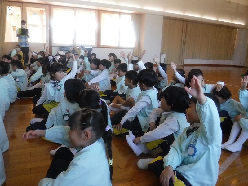その後、映写を観ていきました。道路を飛び出さないことや横断歩道の渡り方などを、子ども達に問いかけながら交通ルールを再確認していくものでした。「交通ルールは命を守る大切なお約束です。」というおまわりさんの言葉が胸に響きました。 警察署の方と市役所の方の話を落ち着いて真剣に聞いている年長さんがとてもすばらしかったです。