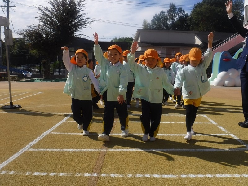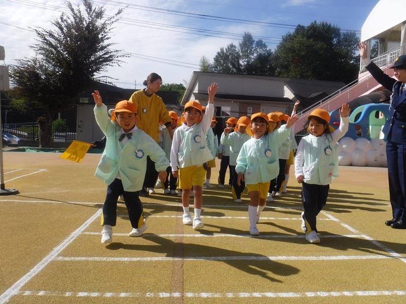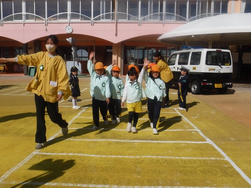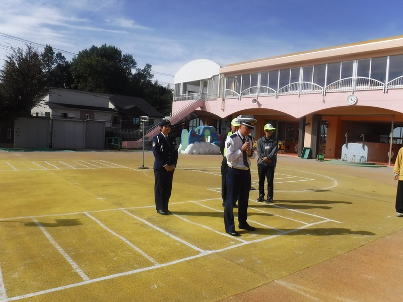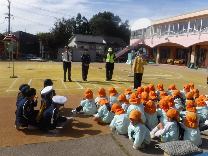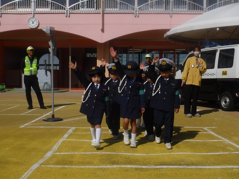今日は、ちびっこ警察官のお友だちが「信号がピカピカしてるよ」「青だよ」と教えてくれましたが、また家庭の方でも子どもたちと確認して頂き交通事故にあうことのないよう、子ども達の意識が高まるといいなと思います。お巡りさんから「今日の横断歩道の渡り方は80点でした。横断歩道ギリギリではなく1歩後ろで待ちましょう。」とお話がありました。小学校入学まであと半年、歩道の歩き方100点目指してがんばろう‼