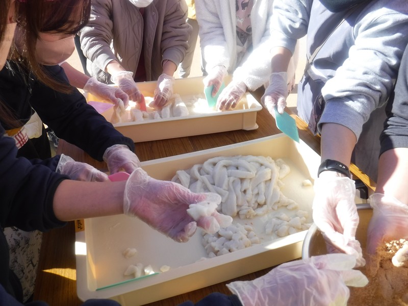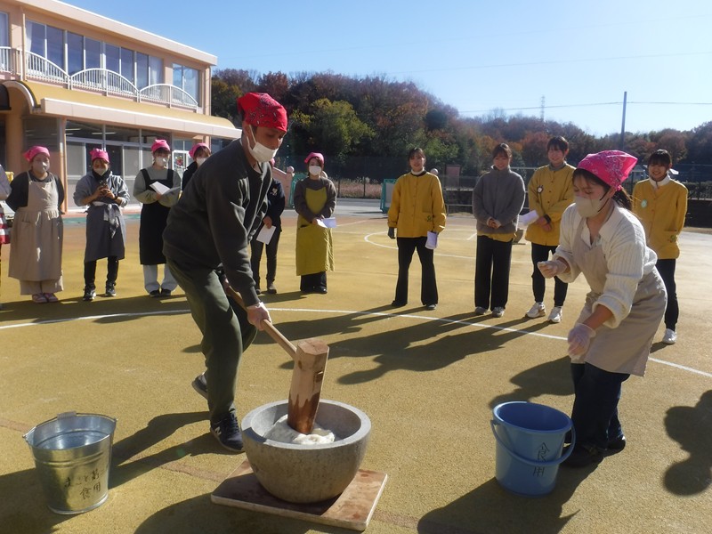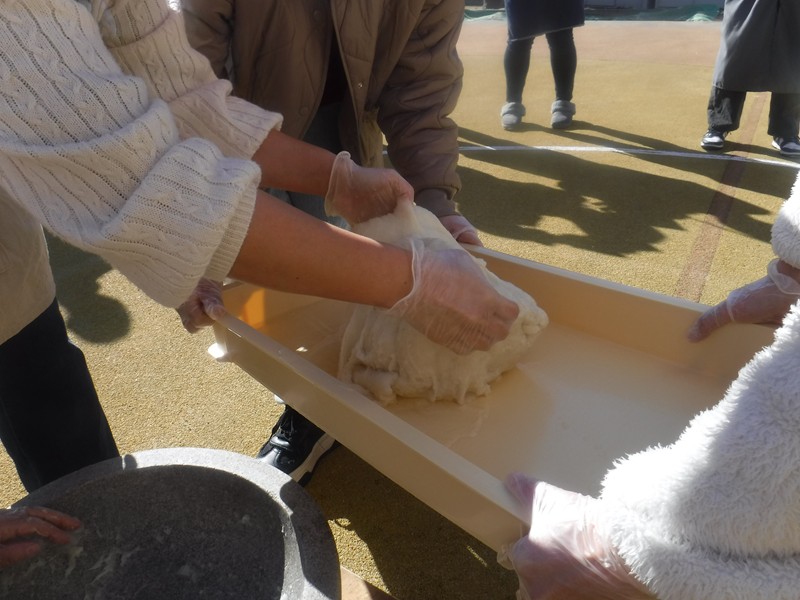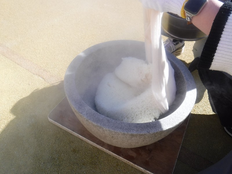 ☆明日はおんぶです♪ ぽかぽか暖かい中。PTA役員さんと明日のおもちつきのリハーサルをおこないました。園長先生からおもちのつき方、手返しの仕方をレクチャーしてもらい、とっても美味しいおもちがつきあがりました!ますます明日が楽しみになりました。みんなでおいしいおもちをつこうね!
