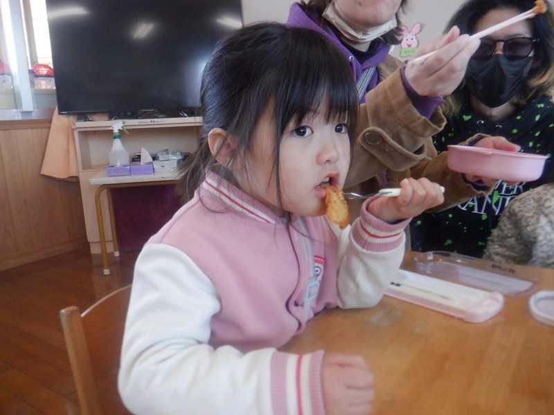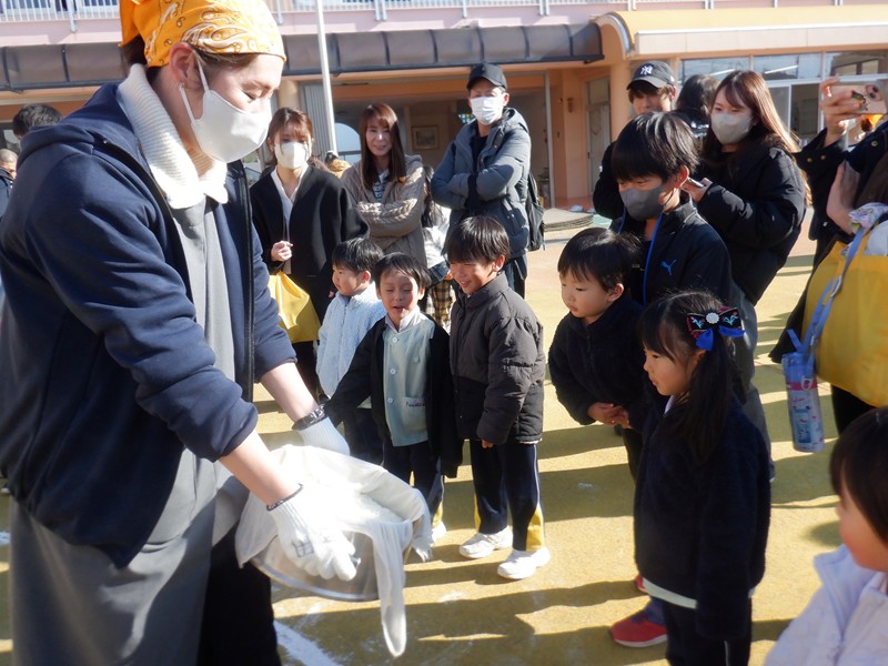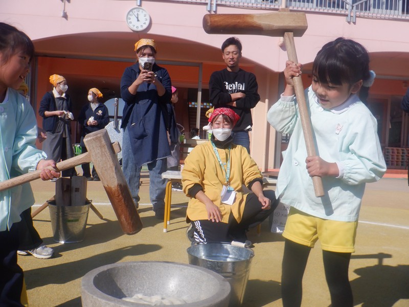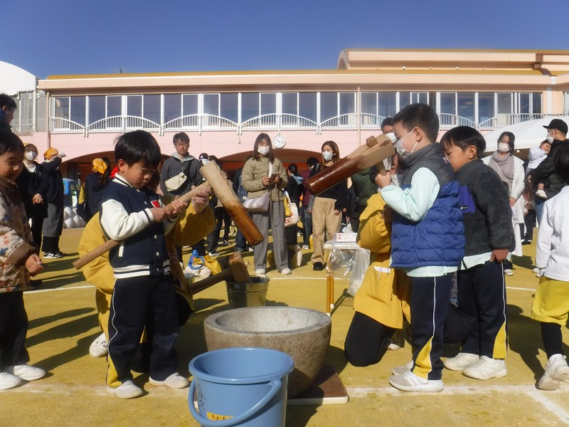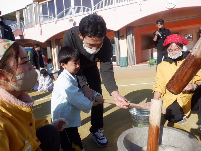 年少、年中、年長と時間をずらして年少さんは1うす、年中・年長さんは2うす、餅をついていきました。最後の仕上げは子ども達(●^▽^●)子ども用のきねで一生懸命、餅つきを頑張ってくれました。お父さん、お母さん、子ども達のパワーが合わさってツヤツヤ柔らか、とっても美味しいお餅が出来上がりました。年少さんにはきねが重たくてよろよろ…。でも楽しかったよね♪