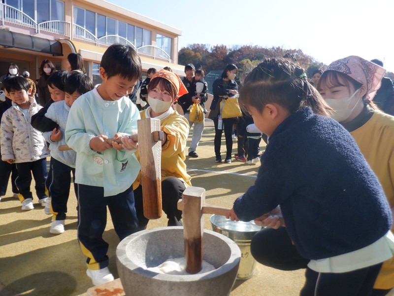 初めにほかほかに蒸しあがったつぶつぶのもち米を見ていくと「ごはんみたい!!」「いい匂い~♪」なんて声があがりました。餅米の粒をある程度つぶした後にいよいよ餅つきです。力持ちのお父さんが重たいきねを振り上げて力いっぱいつき、手返しをするたびにどんどんおもちへと変身してしていきました♪